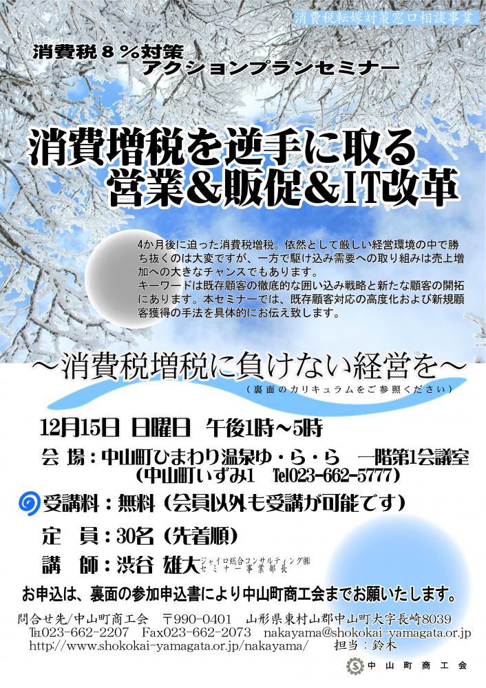 セミナータイトル 「消費税増税を逆手に取る営業&販促&IT改革」講師 渋谷雄大氏(ジャイロ総合コンサルティング梶@セミナー事業部長)日時: 12月15日 日曜日 午後1時〜5時会場:中山町ひまわり温泉ゆ・ら・ら 一階第1会議室 (中山町いずみ1 023-662-5777) 定員:30名(先着順)受講料:無料問合、お申込先:中山町商工会 023-662-2207(お申込は、チラシpdfの裏面をご参照ください)4か月後に迫った消費税増税。依然として厳しい経営環境の中で勝ち抜くのは大変ですが、一方で駆け込み需要への取り組みは売上増加への大きなチャンスでもあります。キーワードは既存顧客の徹底的な囲い込み戦略と新たな顧客の開拓にあります。本セミナーでは、既存顧客対応の高度化および新規顧客獲得の手法を具体的にお伝え致します。(カリキュラムの詳細は、チラシpdfの裏面をご覧ください。) 【10月16日の消費税セミナーにお申込みいただいた皆様へ】 10月16日のセミナーにつきましては、天災のためとはいえ開催することが出来ませんでした。深くお詫び申し上げます。今回は、10月16日のセミナーを再度企画したものです。前回お申込いただいた方も、宜しければ是非ご参加くださいますようご案内申し上げます。