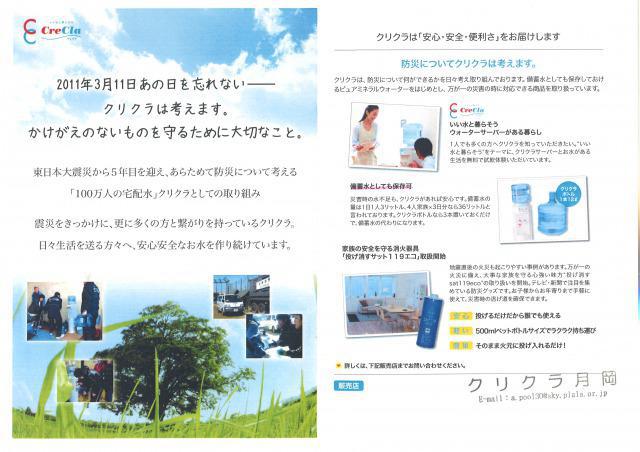 2011.3.11から5年目を迎えました。私は休日に南三陸へ行く機会があり、観光地へ行ってきました。 地域には、高台移転した住宅が一斉に建設中のほか、自分のお店を新しく建て直し、再開される住民の方々もいらっしゃいました。少しずつ復興している一方で、まだ がれきが残っている場所も見受けられました。 中には、被災した状態でそのまま残っている学校があり、当時教室だった部屋の中には、どこからか流されてきた車ががれきと一緒に残ったまま。。そして、すぐ隣に建てられていた体育館は鉄筋の建物と思われるのですが、老朽化が進んでいたのか鉄筋部分はほとんど崩れ落ちていました。 間近で見るのはこれが初めてだったのであまりの衝撃に言葉を失いました。まだまだ大変な思いをされている方々が大勢いらっしゃるのだと、現地に行って改めて実感しました。 〜〜〜〜〜〜〜〜〜〜〜〜〜〜〜〜〜〜〜〜〜〜〜〜〜〜〜〜〜〜〜〜〜〜〜〜〜〜〜〜 ■やっぱりひとごとにはしておけない防災 震災以降、災害への備えは以前より強化されたのではないでしょうか。(*゚v゚*)または、「うーん、何から備えようか迷ってしまって、手つかずの状態だわ。」とお思いの方もいらっしゃるかと思います。日々の生活にちょっとした工夫を取り入れたらきっとプチ防災につながりますよね!  ■最寄りの避難場所は明確ですか?■出かける時は、行き先を記したメモ書きを残す※または、スマホアプリ「 LINE 」 で家族のグループを作成しておけば、メモ書きを残さずとも気軽にメッセージを残すことも出来ますね♪〜LINEグループ作成の仕方〜1.LINEを起動する2.トップ右下:その他>左上:友達追加マーク>グループ作成>3.グループ名編集4.+[追加] マークで追加したい人を選択後、右上:招待 をタップ5.保存                   ※iphone操作時の仕方になります   ■防災グッズの確保!ろうそく、食料、水、簡易トイレ、ラジオ、ライト、電池、毛布などなど 私は元々アロマキャンドルなどが大好きでお部屋には常に5,6個キャンドルがある状態だったので、震災時停電した際は親戚に譲ることができました。 そしてラジオ!当時はテレビ付の携帯があり、震災の状況を見ることができましたが充電もったいない!(笑) ということで中学生の時に授業で必死に作ったラジオを我が家では愛用しました(笑)やっぱり災害時の情報はラジオですね!  震災当時のスーパーは食料を求めて大勢の方々が駆け込みました。普段は大量に置いてあるペットボトルのお水も品薄状態が続きましたよね。「水道水が使えない!」そのような緊急時にもご利用いただけるのがクリクラのお水! 普段は、電気でお湯を保温、お水を冷却していますが、停電時には電気が使えませんよね。(;_;)しかし、クリクラは普段通りレバーを傾けると、電気が通っていなくても常温のお水は出てきます!! そのお水を使用し、暖をとならきゃいけない時期には、お粥やスープ。今回の震災でも水が使えずお風呂に入れない方も多くいらっしゃいましたよね、例えば暑い夏の時期には お水を別な容器に移して、身体の汗を流すこともできます! そしてクリクラボトルは未開封で"約半年"保存がきくので、備蓄水 としてもご利用いただけます!(今回の記事にパンフレットを添付していますのでご覧ください)非常時にも様々な用途のあるクリクラを一度見直してみてはいかがでしょうか ☆彡