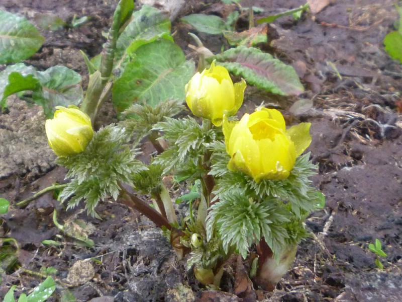 畑の雪もすっかり溶けて春の花たちが顔を出す季節となりました。今日はあいにくの雨。半開きの福寿草になってしまいました。