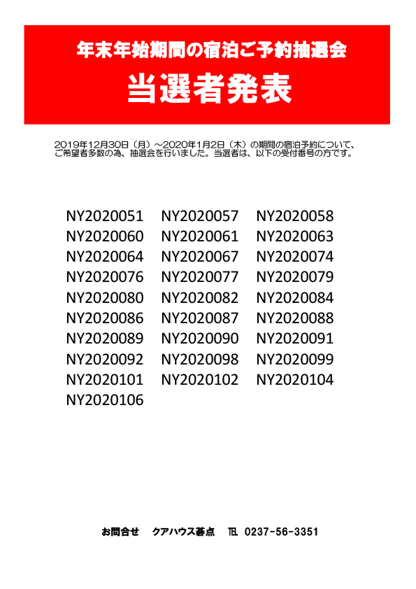 2019年12月30日(月)〜2020年1月2日(木)の期間の宿泊予約について、 ご希望者多数の為、抽選会を行いました。