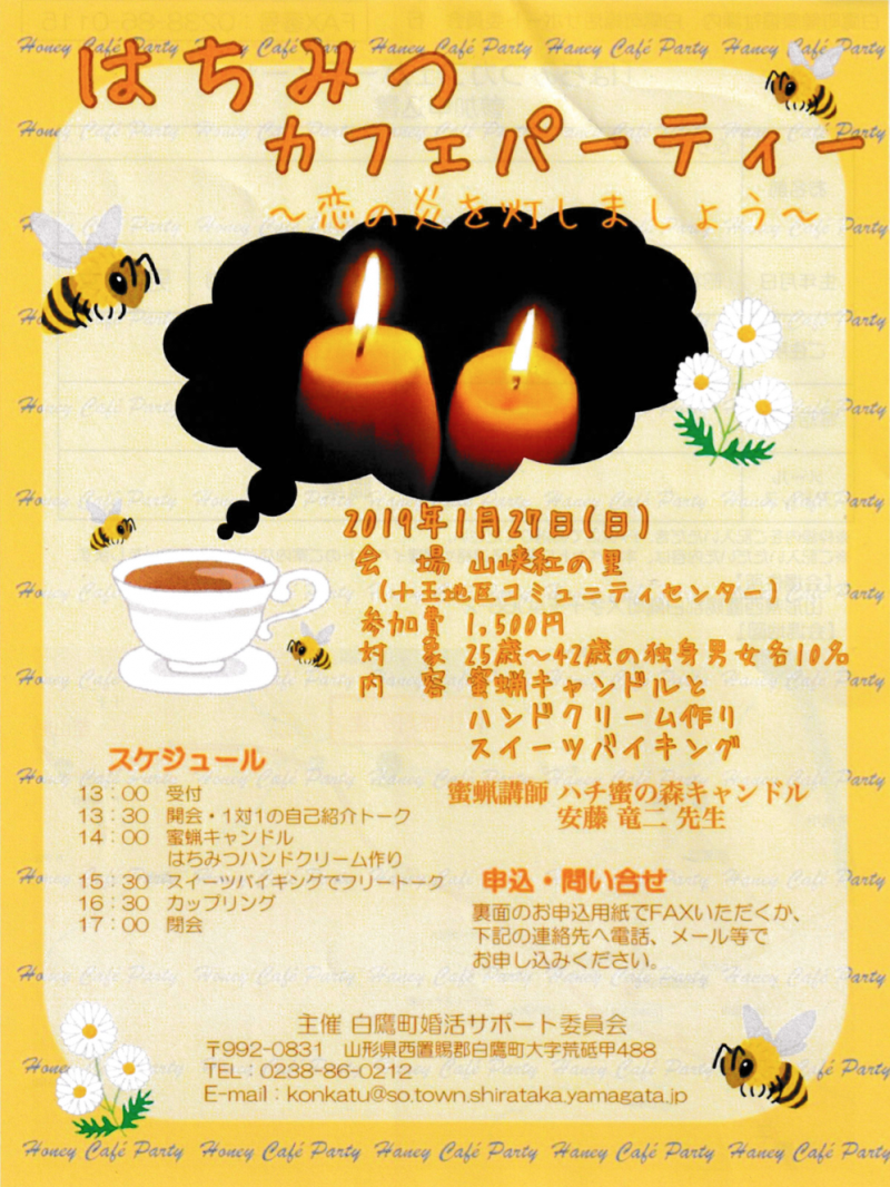 紅花の里西置賜郡白鷹町の婚活パーティーでキャンドル作りとハンドクリーム作りのワークショップを開催いたします。終了後のスイーツバイキングではハチミツティーもいただけるそうです。