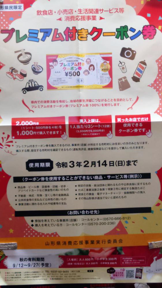 当店でのプレミアム付きクーポン券の販売は10月27日が火曜日定休日のため10月28日午前11時よりの販売となりますご了承ください。売り切れ次第終了です。村山市市民が対象です