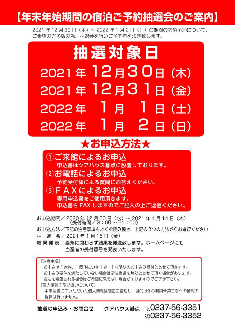 2021年12月30日(木)〜2022年1月2日(日)の期間の宿泊予約について、 ご希望の方多数の為、抽選会を行いご予約者を決定致します。