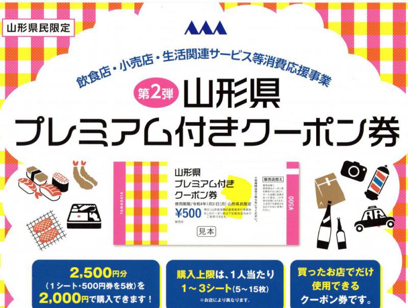 第二弾 山形県プレミアム付きクーポン券の販売を10月16日(土)11:00〜 当店で販売します ご利用下さい一人3シート購入で30数名で完売ですご了承下さい*購入した券は当店のみでの利用となります