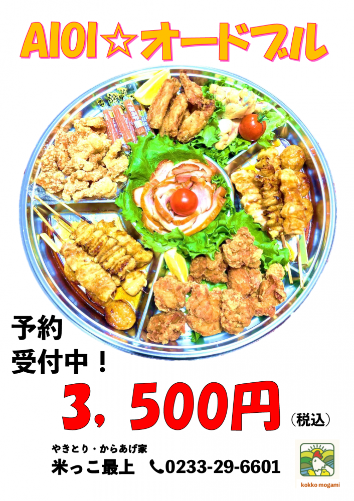 最上どりの美味しさを存分に味わえる最上どりづくし「AIOI★オードブル」 *やまがた最上どりはお米で育てています!*全国初の農場HACCP認証で安心安全!★最上どりの唐揚げ★最上どりのやきとり★最上どりのカルパス★その他年中【ご予約】受付中!AIOI_感謝のスペシャルプライス♪3,500円(税込)