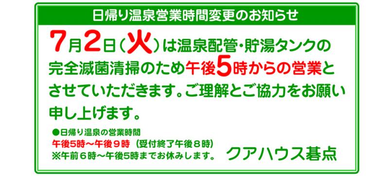 7月2日(火)は温泉配管・貯湯タンクの完全滅菌清掃のため
