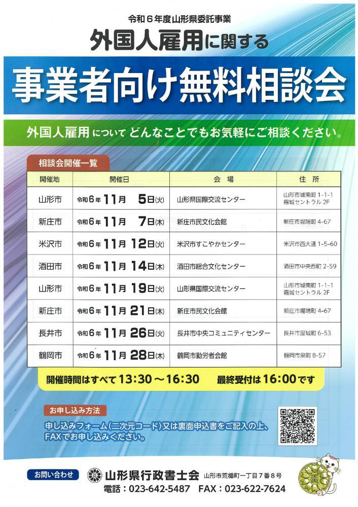 標記の件につきまして、山形県より添付のとおり連絡がありましたのでご案内いたします。ぜひ、ご活用ください。 画像1:外国人雇用に関する事業者向け無料相談会画像2:日本語教室開催支援事業費補助金
