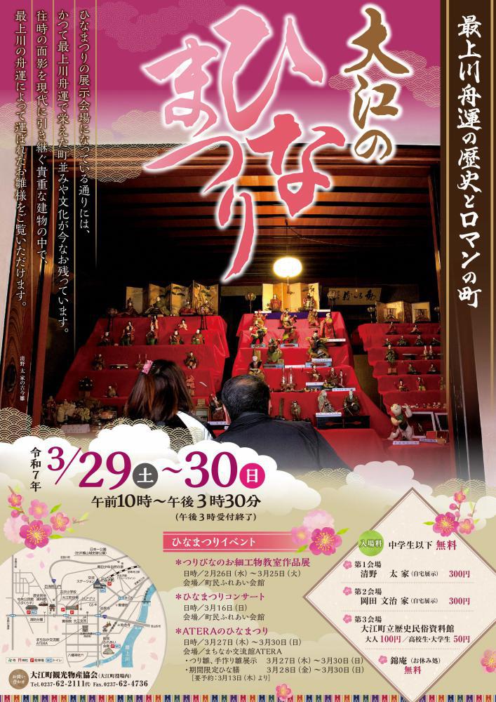 大江町は、最上川舟運の中継地として栄えた歴史を持ち、原町や中央通り商店街の町並みは商家や造り酒屋が建ち並び、今日なお往時の隆盛を物語っております。これらの街並みが平成25年3月に風景の国宝ともいわれる国の重要文化的景観に選定されました。ひなまつり期間中は貴重な建物の中でお雛様を見ることができ、舟運時代の繁栄ぶりを偲ぶことができます。【開催日】令和7年3月29日(土)、30日(日) イベント内容≪お雛様の展示≫展示会場@町内個人宅(清野家、岡田家)受付時間:午前10時〜午後3時(午後3時30分終了)料 金:各会場300円、中学生以下無料A大江町立歴史民俗資料館受付時間:午前10時〜午後3時(午後3時30分終了)料 金:大人100円、学生50円、中学生以下無料Bお休み処 錦庵受付時間:午前10時〜午後3時(午後3時30分終了)料 金:無料あたたかい甘酒のふるまいがあります。≪うちのお雛さま見でけらっしゃい≫ 町内協力店舗によるお雛様の展示(予定)時 間:各店舗営業時間内料 金:無料協力店舗:割烹きくや、御菓子処蝶谷、山十呉服店、廣野屋呉服店、アンドウ洋品店、銘菓処藤岡屋、クスリのいちきゅう、林武一郎商店、ヘアーサロン・カメトコ、洋服のクローバー、藤島屋菓子店、鈴木米穀店、菊地写真館、菓房かしくら、テルメ柏陵、まちなか交流館≪中学生以下限定!お菓子プレゼント≫雛展示会場(町内個人宅2会場、資料館、お休み処錦庵)の4カ所で、中学生以下のお子さんに町内菓子店の銘菓をそれぞれ1個ずつプレゼントします。各会場でお菓子は違いますので、全ての会場を回って4種類のお菓子をGETしよう!
