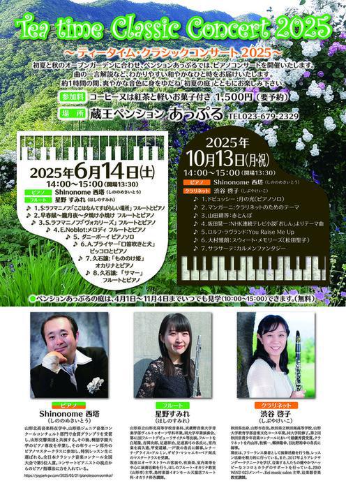 6月に、フルート奏者の星野すみれさんとピアニストのShinonome(しののめ)が、蔵王ペンション村のペンション「あっぷる」さんでコンサートをします。(詳しくは、このメッセージに添付してあるチラシをご覧ください。できるだけ、「あっぷる」さんへの事前お申し込みにご協力頂けるとこちらも人数の把握がしやすく、非常に助かります。) 蔵王ペンション村では、それぞれのペンションで、お庭を公開しているところがとても多く、お庭の個性が楽しめます。「あっぷる」さんでは、いろんな草花の販売もしております。オープンガーデンは、入場無料ですので、ペンションの個性の違いを楽しんでみてくださいね! 今回で2回目となる、星野さんとの共演、今回は、フルートとピッコロとオカリナをその曲に合わせて持ち替え演奏します。ピアノのソロ演奏もあります。「音楽」と「自然美」の相性は抜群です! 山の新鮮な空気を吸って音楽を聴いてリフレッシュしませんか?ご自分への「癒し」「プレゼント」にもなりますね!ご友人やご家族で(お一人のご参加も大歓迎!)、「初夏の非日常」をどうぞ、お楽しみください。お待ちしております!!
