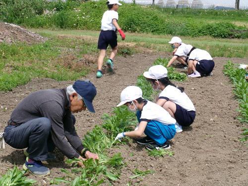 5月23日(金)、4年生が紅花の若芽を間引く活動をしました。当日は紅花の先生2名に来ていただき、間引くこつを教えていただきました。子供たちにとって、元気な若芽を残しながら均等に間引くのは少し難しかったようですが、一生懸命活動する姿はさすが上学年の仲間入りをしただけあります。間引いた若芽は、子供たちの給食におかずとしてだだしていただけるそうです。「どれを抜くといいのかな?」 間引いた若芽の根を取って、調理場に持っていっていただきました。根をちぎると、手がオレンジ色に染まってきます。子供たちは「これが紅花の紅になるんじゃない?」と?(?テナ)を見付けながら活動していました。 紅花の先生に、しっかりお礼を伝えました。毎年ご指導いただき、本当にありがとうございます。