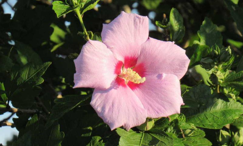 ●昨日雨が降り恵みの雨かと思っていたが土にはあまりしみこまずもう一雨ほしいです 花木「ムクゲ」のピンクの花が咲いています ハイビスカスや大きな花を咲かせてくれる白や薄紫色の「フヨウ」ともよく似ています 白いムクゲの花にはハチが花粉まみれになって蜜を吸っています 夏を代表する花木の一つです