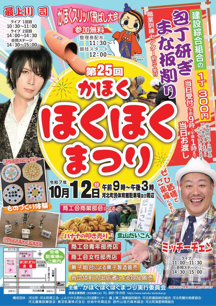 【必見】第25回かほくほくほくまつり完全ガイド!最上川司&ミッチーチェンLIVE、スリッパ飛ばしなど体験満載!山形県村山地域の中でも特に個性的なイベントとして知られる「かほくほくほくまつり」が今年も開催されます!最上川司さん、ミッチーチェンさんの豪華ステージをはじめ、河北町名物の「スリッパ飛ばし大会」、プロの技が光るサービス、そして地元グルメが大集合する、見て、食べて、体験して楽しい一日を徹底解説します!  イベント概要:日時・場所・アクセス  開催日時: 令和7年10月12日(日)午前9時〜午後3時  開会式: 9:00スタート  場所: 河北町民体育館駐車場及び周辺  駐車場: 会場周辺に臨時駐車場あり(チラシをご確認ください)  【5選】絶対に見逃せない!ほくほくまつりの感動の目玉企画 1. 豪華ステージLIVE & 合同ステージ※最新スケジュールに更新しました!  キッズダンスパフォーマンス: 開会式終了後すぐ! 最上川司 LIVE 1回目: 10:30〜11:00 ミッチーチェン LIVE: 11:00〜11:30 最上川司 LIVE 2回目: 14:00〜14:30 【必見】合同ステージ: 14:30〜15:00 2. 名物「かほくスリッパ飛ばし大会」河北町名物のスリッパを遠くまで飛ばす、熱気あふれる競技!整理券配布は11:30から、競技は12:00スタートです。参加無料! 3. プロの技!包丁研ぎ&まな板削り河北町建設総合組合による大人気サービス。家庭で切れ味が落ちた包丁や、使い込んだまな板をプロが修繕!当日受付は午前9時から(1丁300円)。 4. 絶品!商工会青年部&女性部のグルメ屋台商工業関係者による各種販売ブースが登場!バナナのたたき売りや、地元産品を使った葉山だいこん、菓子組合による菓子製造販売など、お腹も心も満たされること間違いなし! 5. 楽しいものづくり体験お子様も楽しめる「ものづくり体験」(コースター作り、ねじでおもちゃ作り)ブースも設置されます。旅の思い出になる作品を持ち帰りましょう。  中の人からの一口メモ(経験談)【最上川司さんのステージは必見!】 演歌歌手としての魅力はもちろんですが、実はロックバンドのボーカルもされているんです。その歌声のギャップが最高にカッコよく、一度聴いたらファンになること間違いなし!今回は合同ステージもあるので最後まで見逃せません!そして、河北町は知る人ぞ知るスリッパの町。スリッパ飛ばし大会は、想像以上に白熱して盛り上がりますよ!さらに、地元の建設組合さんによる包丁研ぎ・まな板削りは、家庭に絶対に必要なサービスです!プロの技で新品同様の切れ味・使い心地が復活します。この機会を逃さないで!  イベント詳細情報・お問い合わせ先  主催・運営: かほくほくほくまつり実行委員会  お問い合わせ: 河北町商工会内(TEL: 0237-73-3122)  公式サイト: 河北町商工会 公式サイト  よくある質問 (FAQ)   スリッパ飛ばし大会の参加は無料ですか? はい、参加無料です。ただし、競技の整理券配布時間が11:30からとなっていますので、お早めに会場へお越しください。   包丁研ぎ・まな板削りの料金と受付時間を教えてください。 包丁研ぎ・まな板削りは1丁(1枚)300円です。当日受付は午前9時からとなります。大変人気のあるサービスのため、お早めの受付をおすすめします。   雨天の場合も開催されますか? 荒天時以外の開催情報については、公式サイトまたは主催者へ直接お問い合わせいただくことをおすすめします。屋外イベントも多いため、天候によっては内容が一部変更となる可能性があります。  /* ホバーエフェクト用CSSは削除された関連セクションにのみ適用のため、基本維持(今後の追加に備え) */? ? ? .related-card {? ? ? ? transition: transform 0.3s ease, box-shadow 0.3s ease;? ? ? }? ? ? .related-card:hover {? ? ? ? transform: translateY(-5px);? ? ? ? box-shadow: 0 8px 20px rgba(0,0,0,0.15) !important;? ? ? }? ? ? /* 中の人おすすめポイント用 */? ? ? .recommend-box {? ? ? ? border: 3px solid #ffcc66; /* テーマカラー:オレンジ系 */? ? ? ? background-color: #fff9e6;? ? ? ? padding: 15px;? ? ? ? margin: 20px 0;? ? ? ? border-radius: 10px;? ? ? }? ? ? .recommend-title {? ? ? ? color: #e67e22; /* アイコンカラーも統一 */? ? ? ? font-size: 1.2em;? ? ? ? margin-bottom: 10px;? ? ? ? border-bottom: 2px solid #ffcc66;? ? ? ? padding-bottom: 5px;? ? ? }     ? ? {? ? ? "@context": "https://schema.org",? ? ? "@graph": [? ? ? ? {? ? ? ? ? "@type": "Event",? ? ? ? ? "name": "第25回 かほくほくほくまつり",? ? ? ? ? "startDate": "2025-10-12T09:00",? ? ? ? ? "endDate": "2025-10-12T15:00",? ? ? ? ? "eventStatus": "https://schema.org/EventScheduled",? ? ? ? ? "eventAttendanceMode": "https://schema.org/OfflineEventAttendanceMode",? ? ? ? ? "location": {? ? ? ? ? ? "@type": "Place",? ? ? ? ? ? "name": "河北町民体育館駐車場及び周辺",? ? ? ? ? ? "address": {? ? ? ? ? ? ? "@type": "PostalAddress",? ? ? ? ? ? ? "addressRegion": "山形県",? ? ? ? ? ? ? "addressLocality": "西村山郡河北町",? ? ? ? ? ? ? "streetAddress": "河北町民体育館周辺"? ? ? ? ? ? }? ? ? ? ? },? ? ? ? ? "image": [? ? ? ? ? ? "25回ほくほく_チラシ.jpg"? ? ? ? ? ],? ? ? ? ? "description": "最上川司、ミッチーチェンによるLIVEステージ、名物スリッパ飛ばし大会、プロの包丁研ぎ・まな板削りなど、お得で楽しい
