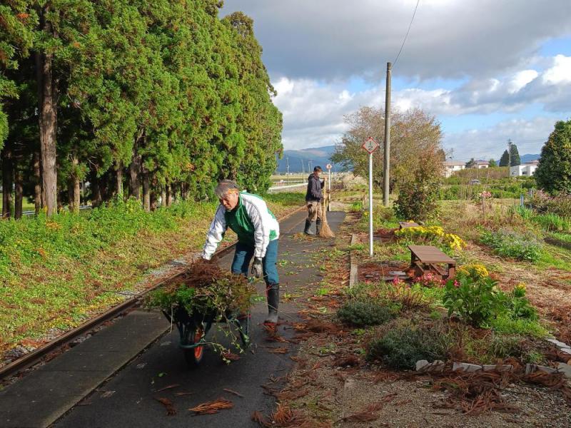 11月2日午前8時、広場と花壇の杉っ葉処理と除草作業を行いました。昨夜来の風雨は止んで、日差しも差し込んでくれました。杉っ葉は大量に散らばり、花壇にはカヤも侵入していました。草刈り機、剪定鋏、草削り、ブロワーなど様々な道具を持ち寄っての作業となりました。おかげで、いつ初雪が来ても大丈夫な状態になったようです。 そして今回、とても嬉しいことがありました。それは8時25分の上り列車が入って来た時のことです。運転手さんが「どうもご苦労様です」「ありがとうございます。」と声を掛けてくれたのです。初めて聞いたような大きな声でした。こちらも恐縮して、思わず直立して礼をしていました。朝作業のちょっとうれしくなるひと時でした。 「運転手さん、山鉄の皆さん毎日ご苦労様です。ありがとうございます。」 そんな言葉が浮かんで来ました。