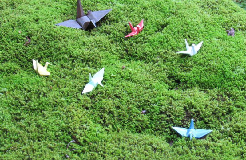 ●今朝も一面の霧に覆われとても寒い朝を迎えました きっと紅葉も進んで鮮やかな赤や黄色の木々が眺められると期待して訪れた昨日の珍蔵寺ですがまだ紅葉には早く 地面はまだ一面のコケで緑色に染まりふかふかした絨毯のようです そんなコケの上に小さな折り鶴がいくつも置いてありました コケが鮮やかな緑だけに一段と折り鶴が素敵に見えました 鮮やかな紅葉までもう少しかかりそうです