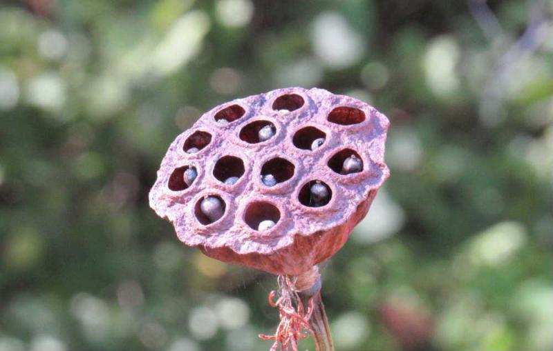 ●ハスの花が咲いた後に「ハスの実」を付けています 穴の開いた部分を花托と呼ぶそうですがその穴に身が詰まっています 奇妙な形をしているので怖いという人もいるそうですがどこかUFOに似ていませんか ハスの実は糖質64% 脂肪2% タンパク質15%含まれていて食べれれるそうです スープや粥 シロップ漬けなどいろいろな食べ方があるそうです 私はまだ食べたことがありませんが