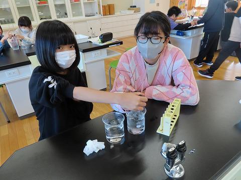 4年生の理科でものの体積と温度の実験をしていました。人数が25人ですが、一人一実験!水の体積の変化を調べていました。隙間なく水を入れた試験管に細い管を入れ、細い管に書いたメモリの変化を見ます。温度を上げるとメモリが上昇、氷に浸すとメモリが下降。何がわかった?