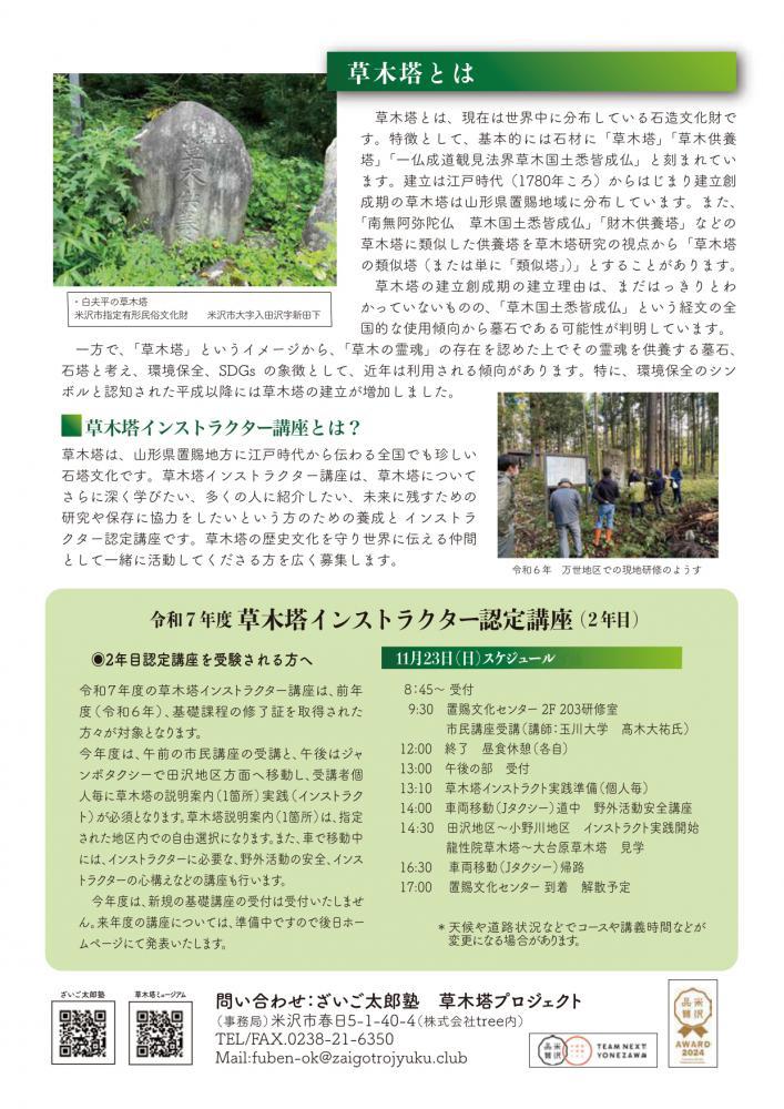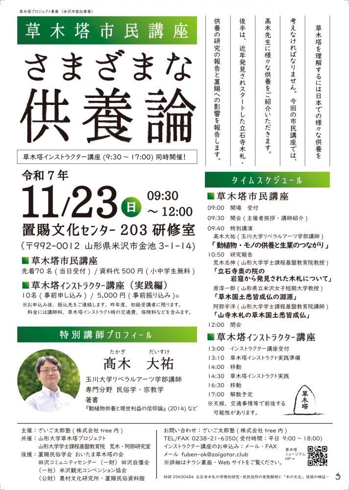 草木塔市民講座開催!「さまざまな供養論」 草木塔を理解するには日本での様々な供養を考えなければなりません。今回の市民講座では、高木先生に様々な供養をご紹介いただきます。後半は、近年発見されスタートした立石寺木札・供養の研究の報告と置賜への影響を報告します。日時 令和7年11月23日(日)9:30〜12:00会場 置賜総合文化センター203研究室■草木塔市民講座 先着70名(当日受付) 資料代500円(小中学生無料)■草木塔インストラクター講座(実践編) 10名(事前申し込み) 5,000円(事前振込み)※お振込み後、振込先をご連絡します。 昨年度初級受講者に限ります。タイムスケジュール開場・受付 9:00開会 9:30特別講演 9:40燒リ大祐(玉川大学リベラルアーツ学部講師)「動植物・モノの供養と生業のつながり」研究報告 10:50荒木志伸(山形大学学士課程基盤教育院教授)「立石寺奥の院の岩窟から発見された木札について」原淳一郎(山形県立米沢女子短期大学教授)「草木国土悉皆成仏の淵源」阿部宇洋(山形大学学士課程基盤教育院講師)「山寺木札の草木国土悉皆成仏」閉会 12:00問い合わせ先ざいご太郎塾(株式会社tree内)電話/ファックス: 0238-21-6350(受付時間:平日9:00〜18:00)メール:fuben-ok@zaigotrojyuku.club