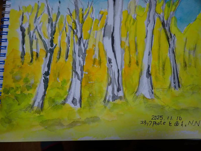 博物園の晩秋を写真に。ブナ林広場辺りでの集合写真から驟雨団を消し画面に映す。