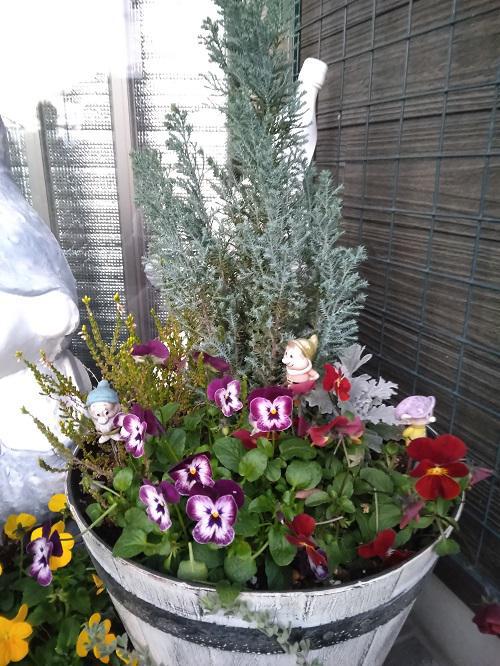 今日は天気も良く、庭仕事しながら青空最後の見納めか!なんてじーじと話しながら今年の冬支度終了しました〜 終わった寄せ植えは先日暗くなってしまい写真撮れなかったので撮ってみたのですが、最後の仕上げのピック(飾り小物)が漏れていたので再度取り直し… 毎年変わり映えしない同じような寄せ植えですが今年は、葉ボタンの種類も少なく間に合わせの出来になってしまいました。ビオラもじーじがネットでまとめ買いしたものを利用、おまけに残っている鉢物に入れ込んだので満足できるものでは無いですが、自分で楽しむものなのでまあ、それでもいいかななんて思っています(^^) お店を見ても毎年種類が少なくなってきているようです。物価高でお花を楽しむのも大変になってきていますよね…我庭も高齢者の年金暮らしなので楽しむ範囲内で。いちばん大変なバラも終活始めているので、メンテに要する時間は大分少なくなって来ました。それでも、剪定が必要な樹々がまだあるので、はしごや脚立を使っての作業は気をつけないといけないじーじです。 さて、寄せ植えは・・・ 玄関上り口に、同じような寄せ植えを並べているだけですが全体の写真撮らないでしまいました…雪が降っても大丈夫なものだけ置いています。