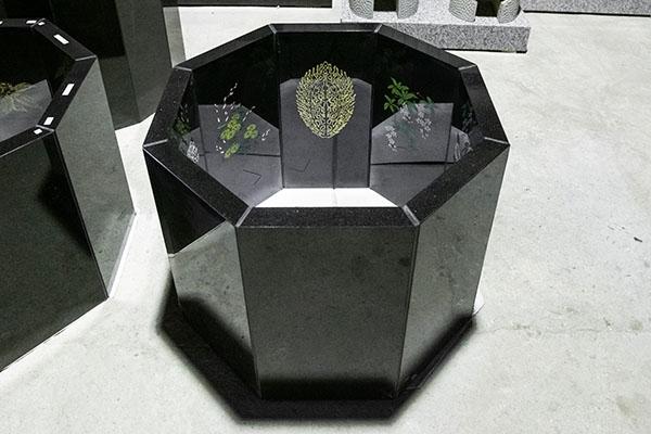 その昔、納骨室の中は「飛鳥の石室」にも見られるように、装飾品と壁画のあるすばらしい空間でした。現在その部分は見えないところなので、おざなりにされ、外観だけが立派に提案されています。平成7年から、石室の勉強を重ねて、春夏秋冬、東西南北、風水学による宇宙空間であったりと、意味を持つ空間であることも分かってきました。それをふまえ、将来自分が休む場所を楽しくするためのお手伝いをさせていただけたらと、作品を作成いたしました。