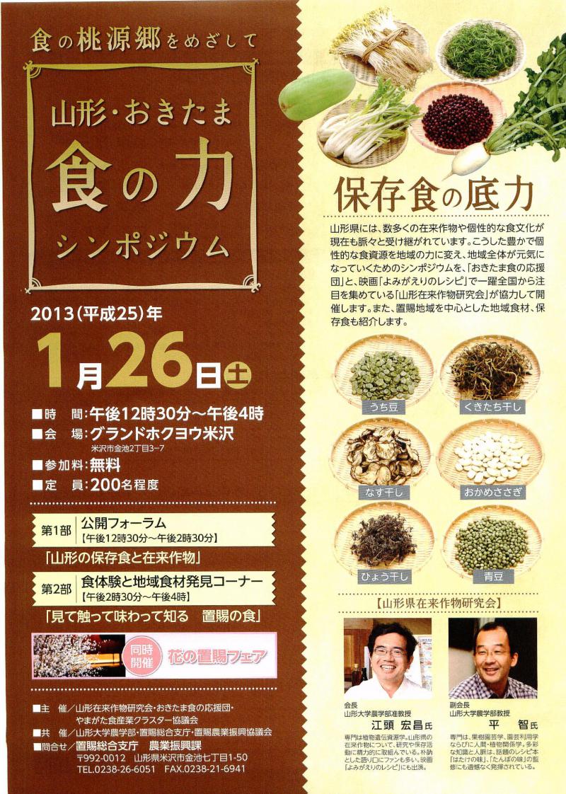 今年の在来作物研究会の公開フォーラムは来年(2013年)1月26日(土)に、在作研として初めての置賜地域、米沢市で行います。