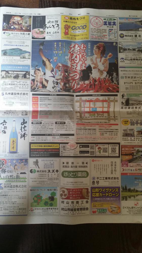 今日から、むらやま徳内祭り始まります!昨日の山形新聞に徳内祭りの宣伝載っていました!当、肉料理あんどうでも広告載せましたが祭り参加の為、期間中の18日19日20日休業となります。ご了承ください。m(__)m皆さん祭り見に来てください(^・^)V