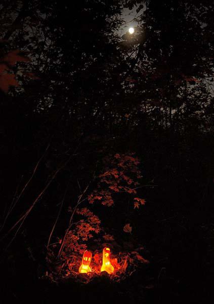 かぼちゃで小人の家形ランタンを作り、紅葉した森で灯します。