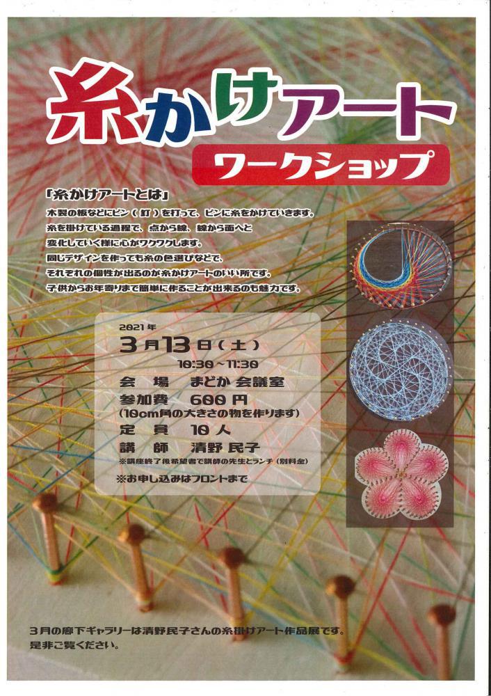 2021年3月13日(土)糸かけアートワークショップ開催「糸かけアートとは」木製の板などにピン(釘)を打って、ピンに糸をかけていきます。糸を掛けている過程で、点から線、線から面へと変化していく様に、心もワクワクしますよ。同じデザインを作っても、糸の色選びによって作品が変わって、個性が出るのも楽しいし、簡単に出来るのが魅力です。時 間10:30〜11:30会 場:まどか会議室参加費: 600円(10cm角の大きさの物を作ります)定 員: 6名講 師:清野 民子※講座終了後希望者で講師の先生とランチ(別料金)※お申込みはフロントまで※3月の廊下ギャラリーは、情野民子さんの糸かけアート作品展です。是非ご覧ください。
