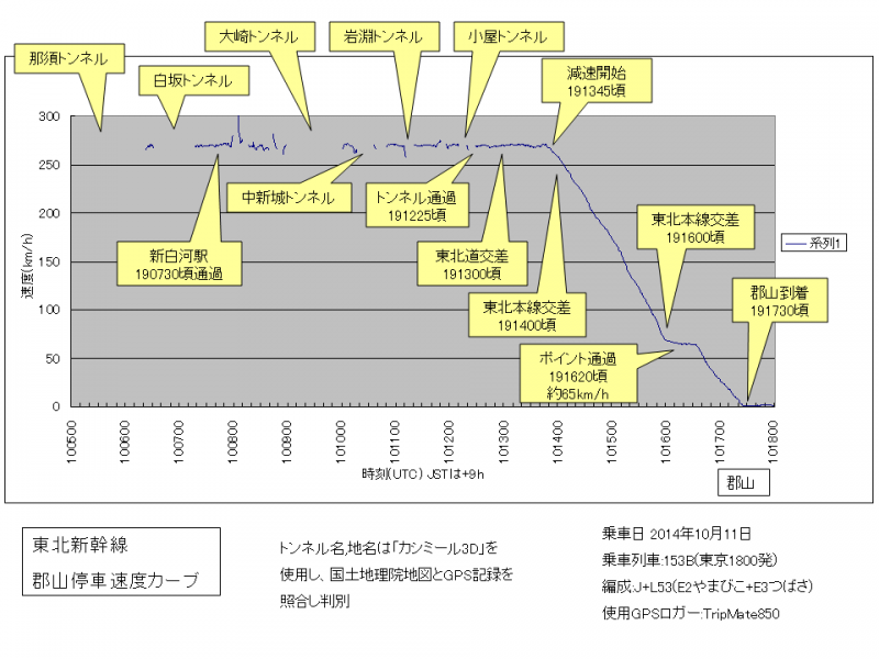次のグラフは、新白河通過から郡山停車まで拡大したもの。