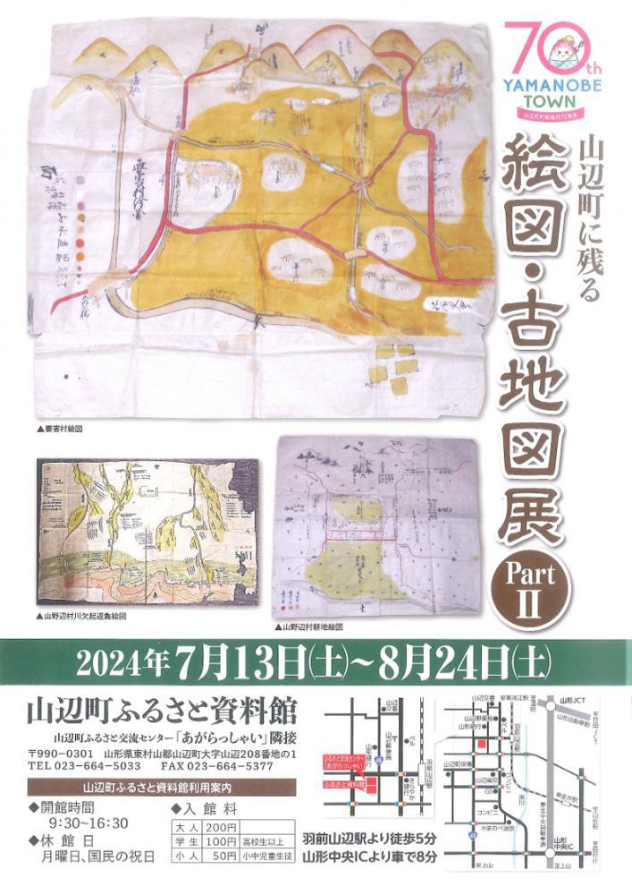 ふるさと資料館にて、町内に残された江戸時代から明治時代までの貴重な地図を展示いたします。【日時】令和6年7月13日(土曜日)〜8月24日(土曜日)午前9時30分〜午後4時30分【場所】山辺町ふるさと資料館住所:山辺町大字山辺208−1【入場料】・大人 200円・学生 100円(高校生以上)・小人  50円(小中児童生徒)【休館日】毎週月曜日、国民の祝日【お問合せ】山辺町ふるさと資料館電話:023−664−5033