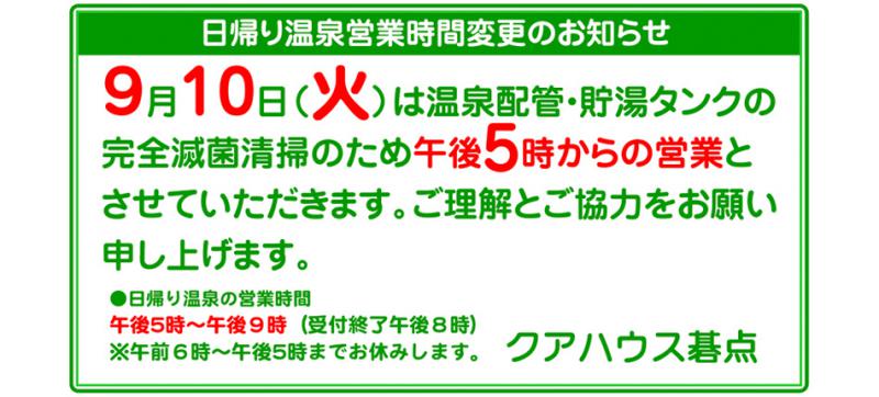 9月10日(火)は温泉配管・貯湯タンクの完全滅菌清掃のため