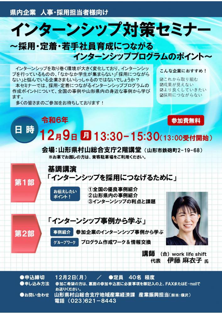 「なかなか学生が集まらない」「採用につながらない」と悩んでいる企業向けに採用・定着につながるインターンシッププログラムの作成ポイントについて、全国の事例や山形県内の身近な事例から学ぶインターンシップ対策セミナーを開催します。詳細はチラシをご覧ください。