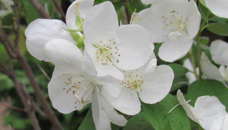 ●梅雨入り前の曇天でも真っ白に映える「バイカウツギ」が隣家の庭に咲いています 梅のような花の形をして茎が中空のために「梅花空木(バイカウツギ)」の名前が付いたのだそうです 4枚の花びらで4〜5センチの白色の爽やかな花です 昨日は曇天でしたが青空にも映える「バイカウツギ」です