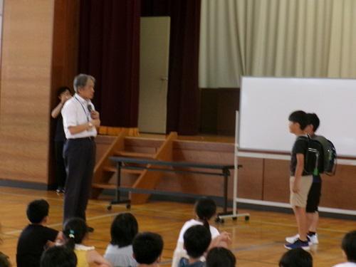 7月1日(火)、不審者対応避難訓練を行いました。置賜教育事務所の青少年指導担当の先生と警察署の少年サポートセンターから先生をお呼びし、子供たちに、より具体的にご指導いただきました。不審者は見た目だけではわからないこと。「車に乗ってその場所を教えて。」などと誘う人は、見た目が優しそうでも不審な人だと思うこと。もしも不審者に会ったときは、距離をとること。すぐ逃げて知らせること。代表の子供たちに役割演技してもらうことで、実際にとる距離の感覚や大声の出し方等も学ぶことができました。また、学校に不審者が侵入したときに、どのように避難し命を守るのかということも併せて学びました。 命を守る合言葉は「今日はいかのお寿司一人前」です。ぜひ、子供たちにこの合言葉の意味を聞いてみてください。