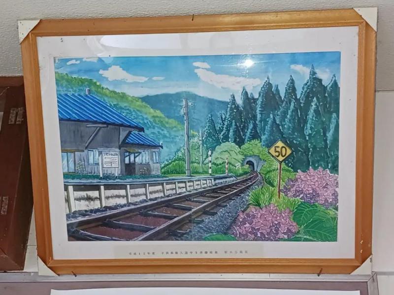 待合室には絵画も飾られていた。中学3年の女生徒の作品であり、「平成12年度子供県展入選作『駅ある風景』」とある。青い山々に囲まれた村の駅舎に、レールが此方と彼方をつなぎながら輝いている。  彼女が描きたいと思った風景を確かめようと、ホームに出てみたが、ホームの高さと同じほどに草が生い茂っていた。輝いていたレールの姿は望むべくもなかった。これが今の「駅ある風景」なのである。  彼女が通っていた中学校は2012年(平成24年)に統合され、廃校となっていた。今、彼女にとってふる里の風景はどこにあるのだろう。改めて駅舎のある風景の重みと温かさを思った。 ※沼沢駅での思い出の記事はこちらからどうぞ  → ああふる里、停車場そして友達:おらだの会