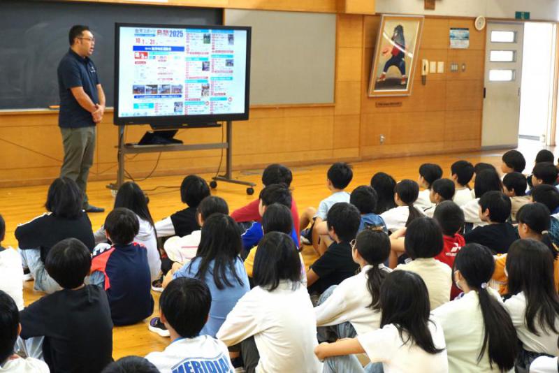 本日の全校朝会は、地域コーディネーターからのコミセン事業の紹介です。本校の地域コーディネーターは、コミセンの主事さんでもあります。コミセン事業の魅力を直接、伝えていただいております。今回は秋のスポーツ関係の事業を紹介していただきました。致芳コミセンには、「一日八里(ひしてはちり)」という長く続いている事業があります。1日でおよそ32qを走破するというもの。コースは毎回かわります。楽しみして参加している子どもたちもいるようです。今回も無事の実施を願っております。コミセン事業の紹介に続いては、命を守るための大事なお話。自転車に乗る際のヘルメット着用の徹底と成田地区の工事現場を通る際の安全確認についてです。子どもたちはしっかりと約束を守ることができると思いますが、保護者の皆様、地域の皆様からのお声がけや見守りも、どうぞよろしくお願いいたします。