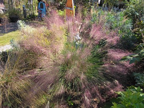 昨日も朝の気温が低く寒い・・・今朝も寒く、日中は暖かくなり庭仕事も進むはずでしたが、グラスをカットしご近所に配ったりで時間はあっという間に過ぎてしまいました。 グラスの”ミューレンベルギア・カピラリス”やっぱり一番いいですね〜♪ 去年から、何回もUPしているグラスです。紫の霧のように見える繊細な散開穂が魅力的!(去年も同じ事書いていますが…) 今年はまとめてUPしようと、10月から写真を残していたのですが、去年と同じような写真に・・・ ↓去年と同じロックガーデンの場所です。一緒に植栽したユーフォルビアも成長して自然な庭の風景になってきました。 ↓今年新しく池の庭山に植栽〜!夕陽があたるとこんな素敵な風景に…。 ↓ここも昨年から増やした入り口のエリアです。いちばんきれいに咲いてくれた所。陽の当たるところを好むようです。ここのグラスの花穂は沢山の方にお分けしました〜♪ (じーじコメント)ピンクもあるけれど真っ直ぐに上に伸びる“カピラリス”が最高です。テレビ番組で見たナチュラルガーデンの植栽品種だったのに憧れて調達しました。