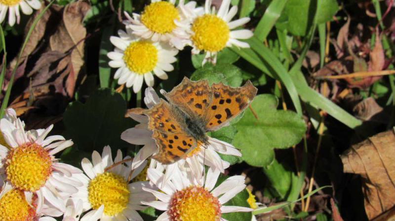 ●まもなく冬を迎えようとするこの時期でですが わずかに咲いている花にとまっている蝶をみつけました 調べてみると「キタテハ(和名で黄立羽)」ではないかと思われます 翅はオレンジ色で褐色の縁取りと黒い斑点がありました この蝶はサナギではなく成虫で越冬するそうですが物陰などにじっとして冬をのりこえるのだそうです たまに日光浴をする姿を見ることもあるそうです 珍しい蝶の一つではないでしょうか